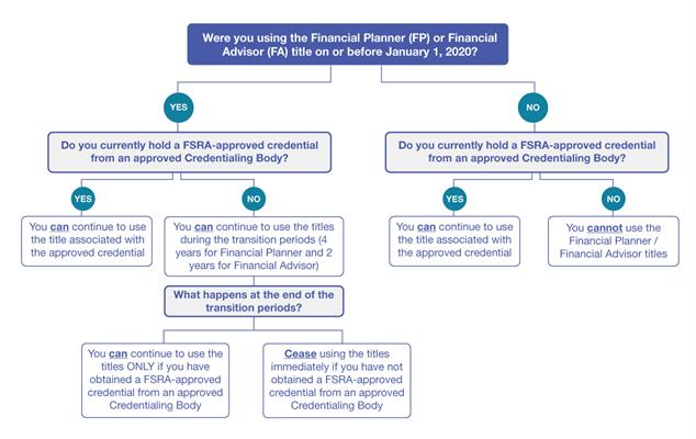 If you started using the title after January 1, 2020, you are only permitted to do so once you have obtained an approved Financial Advisor credential from a FSRA-approved credentialing body. You may alternatively use the Financial Planner title or any